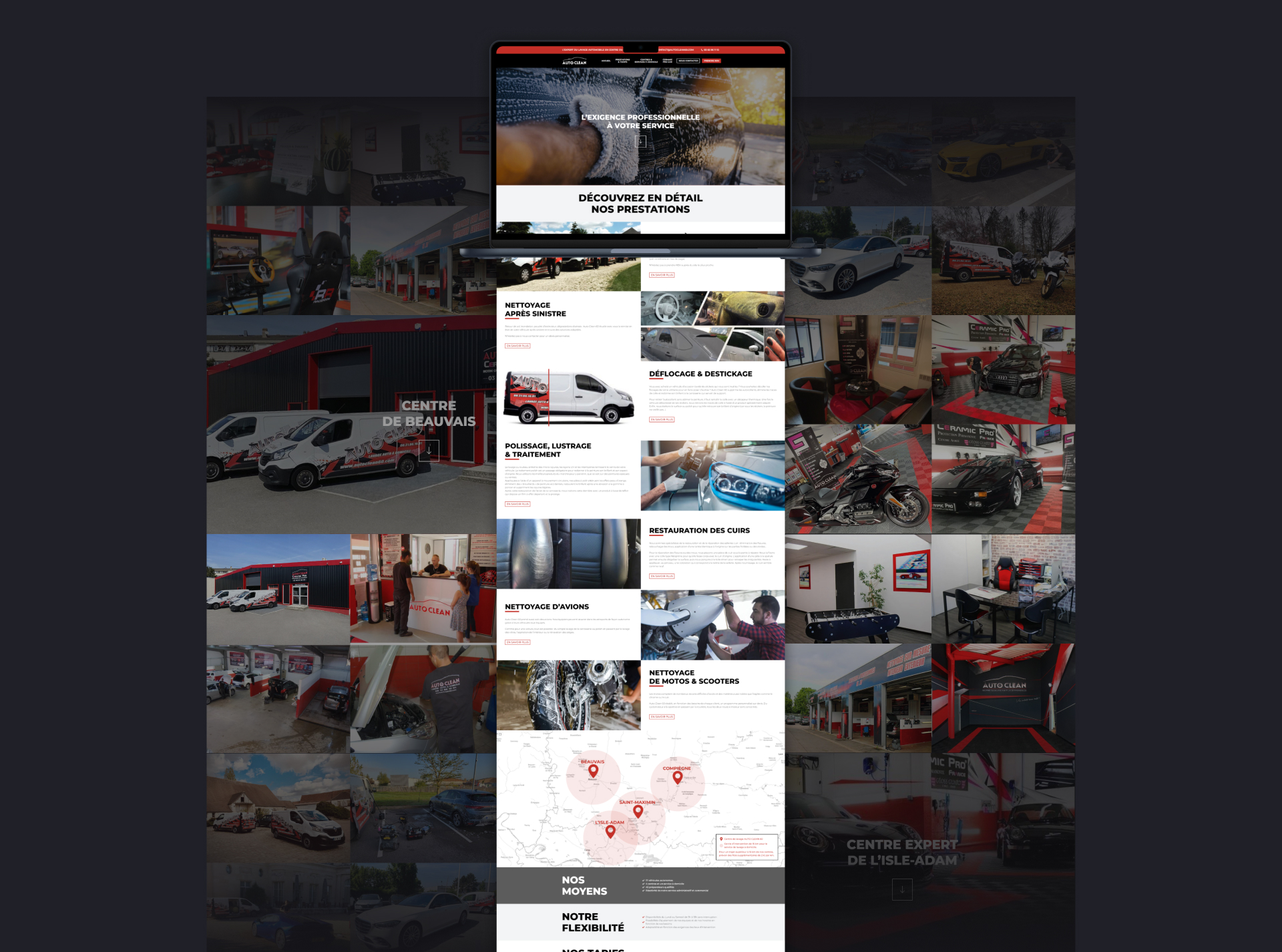 Outre une direction artistique faisant la part belle aux visuels et à la valorisation des offres, la fonctionnalité « Prise de rendez-vous en ligne » a été spécialement implémentée permettant à l’utilisateur de demander une réservation, à domicile ou en centre, en choisissant le programme de lavage qu’il souhaite (extérieur, intérieur, options de finitions…).